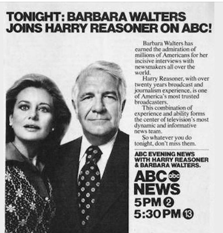 One milestone took place on October 4, 1976, when Barbara Walters joined ABC Evening News alongside Harry Reasoner, becoming the first female co-anchor of a prime-time network newscast.